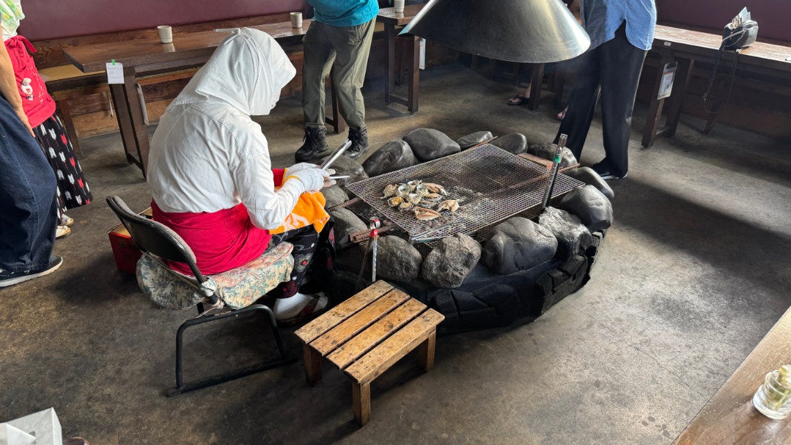 We got back in the car and set off to meet some Ama divers – and enjoy a traditional “ama snack”. These “Ama Huts” are set up to help share the heritage, but also support the divers as climate change has been decreasing their catch and livelihood. There are several Ama huts you can visit but the one we visited really stood out for inclusion. Not only did it have a flat entrance to get in, they also invested in a lift-equipped shuttle bus, accessible bathroom, and prayer rooms for Muslim visitors.